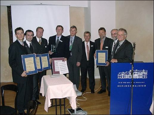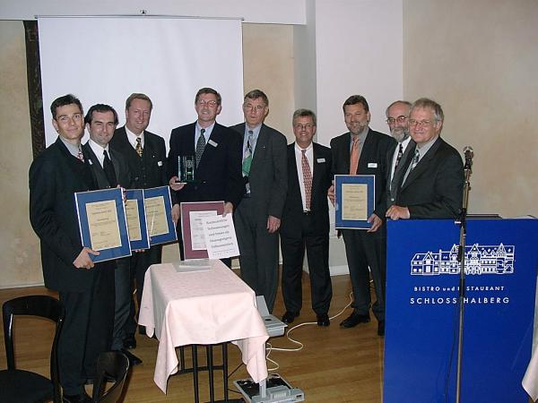 Die Nominierten und Preisträger 2004 - mit der Jury auf Schloss Halberg. Ausgezeichnet wurden die Unternehmen BMW, Bosch, Magna Steyr, Porsche, Volkswagen zusammen mit den beteiligten IT-Dienstleistern.