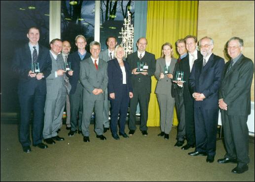 Die Nominierten und Preisträger 2000 - A. Zimmer (BMW), E. Pazzi (moltomedia), U. Schlummer (Bosch), W. Rudolph (Rudolph Logistik), Wirtschaftsminister Dr. H. Georgi, Peter Knorst (Ford), U. Bischoff (VW), Prof. Schmidt, R. Haberlandt (DaimlerChrysler) auf Schloss Halberg.
