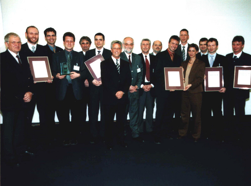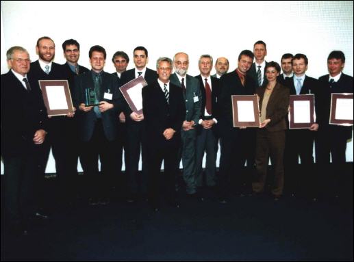 Die Nominierten und Preisträger 2001 - H. Bothe (escate), (bol), A. Klein (Istec), Dr. K. Menzel (bol), P. Knorst (Ford), W. Rudolph (Rudolph Logistik),J. Bergem (FITT), Dr. G. Richartz (Volkswagen), F. Böttcher (DaimlerChrysler), St. Putzlocher (DaimlerChrysler), B. Winkelmann (letmeship), Prof. Schmidt (IPL/HTW), R. Haberlandt (DaimlerChrysler).