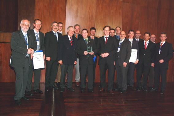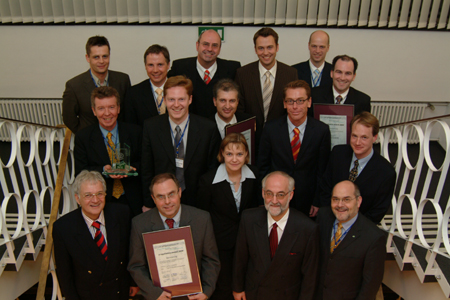 Die Nominierten und Preisträger 2005 - mit der Jury und dem Wirtschaftsminister im Festsaal der Kongresshalle. Die ausgezeichneten Unternehmen BMW, DaimlerChrysler, Mahle mit ihren beteiligten IT-Dienstleistern.