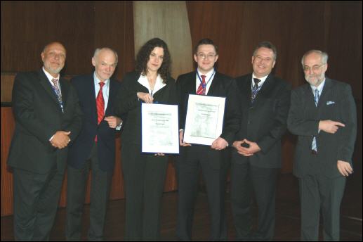 Die Preisträger des SCM University 2005 - mit der Jury im Festsaal der Kongresshalle. Klaus Rümler (gedas Mexico - Jury), Prof. Dr. Klepzig (FH Augsburg, Jury), Dr. Susanne Keller (prämiert in der Gruppe Dissertationen), Rudolf Werner (DaimlerChrysler - Jury), Prof. Dr. Schmidt (AKJ/IPL/HTW - Jury).